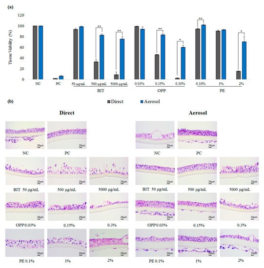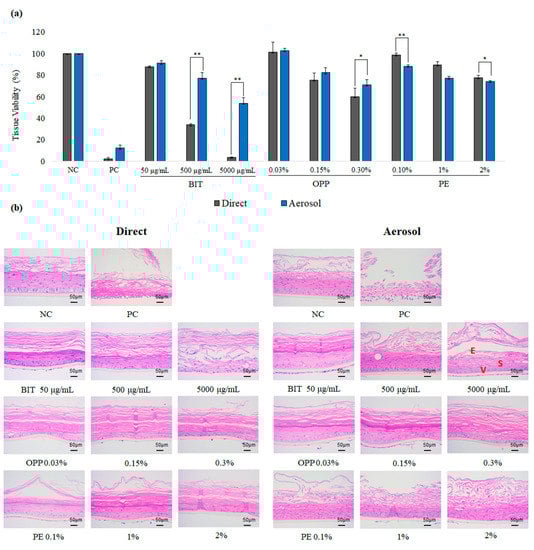 Toxicity of biocides on KeraSkinTM after direct or aerosol application. (a) Tissue viability of KeraSkinTM tissue measured with ((3-[4, 5-dimethylthiazol-2-yl]-2, 5-diphenyl-tetrazolium bromide) (MTT) assay at 48 h after the exposure to biocides through direct (grey bars) or aerosol application (blue bars) for 30 min. Values are mean ± SD (n = 3). NC; negative control (1% DMSO in PBS), PC; positive control (5% sodium dodecyl sulfate); BIT; 1,2-Benzothiazol-3-one, PE; 2-Phenoxyethanol, OPP; 2-Phenylphenol. * p < 0.05 or ** p < 0.01 by Student t-test. (b) Representative histological photographs of the treated tissues after hematoxylin-eosin (H&E) staining. Scale bar is 50 µm. E, V, and S stand for erosion (detachment of epithelial cells), vacuolation (formation of vacuoles in cytosol), and spongiosis (intercellular edema), which was indicated on BIT 5000 μg/mL photo.