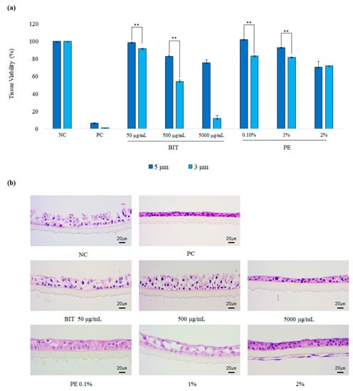 Toxicity of BIT and PE on SoluAirwayTM after the application of 3 µm or 5 μm aerosol: (a) Tissue viability of SoluAirwayTM tissue measured with MTT assay after the exposure to aerosols of BIT and PE with 5 µm MMAD (blue) or 3 µm MMAD (light blue) for 3 h. Values are mean ± SD (n > 2) or ½difference (n = 2). ** p < 0.01 by Student t-test (b) Representative histological photographs of the treated tissues after H&E staining. Scale bar is 20 µm.