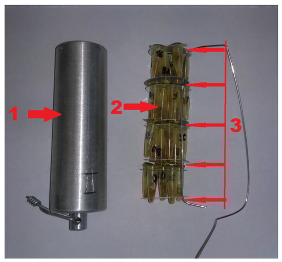Samples in marked closed plastic tubes (Eppendorf AG, Hamburg, Germany) were put layer by layer in aluminum cases with the reference samples whose silver content was known, as shown in Figure 1. The reference samples were prepared just prior to use. For this purpose, a standard sample of silver with a known mass was poured onto sterile cotton wool, and then reference samples with the same geometry as the experimental samples were prepared and placed into plastic tubes. Additionally, known amounts of state standard samples were poured onto paper rings, dried and placed between the layers. Thus, one aluminum case contained one reference sample with the same geometry as the experimental samples and 84 ‘flat’ reference samples. The cases were put into vertical channels of an IR 8 nuclear research reactor (power 8 MeW) and irradiated for 24 h at a neutron flux of 10−12 neutron/sec × cm2 to obtain the necessary activity of the 110mAg radioisotope during NAA.