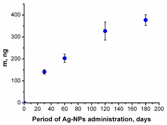 Accumulation of silver in the brain. Dependence of the mass of silver in the brain on the period of administration of Ag-NPs obtained by NAA. Silver monotonically accumulated in the brain over time. Data are represented as the mean ± SEM.