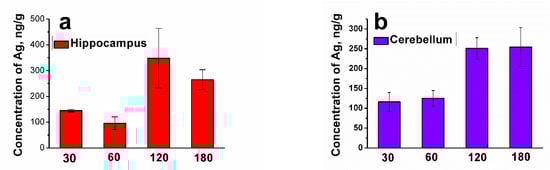 3.2. Accumulation of Silver Nanoparticles in Brains and Their Subregions