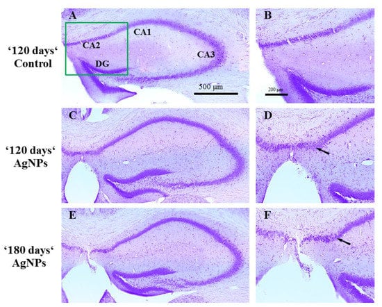 Comparison of hippocampal structure of the mice. Representative Nissl-stained brain tissue sections from (A,B) the control group and Ag-NP-exposed mice in the (C,D) ‘120 days’ and (E,F) ‘180 days’ groups. Visible changes can be seen in the CA2 region of the hippocampus of Ag-NP-exposed mice relative to that of the control mice (arrows). Scale bars: 500 μm (A,C,E), 200 μm (B,D,F).