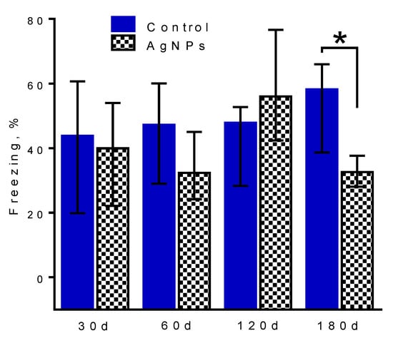 Due to the accumulation of Ag-NPs in the brain and their toxicity to brain cells, some recent works have been devoted to studying the influence of Ag-NPs on the cognitive and behavioral functions of model mammals such as rats and mice [,,,,,]. Usually, such studies are conducted for no more than 30 days, and the doses of Ag-NPs are able to poison animals without acting on the brain [].