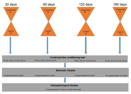 After contextual memory testing of each experimental group, animals were divided into 2 groups: biokinetic studies (BS) (8(12) experimental and 8(12) control mice in each subgroup) and histopathological studies (HS) (2 experimental and 2 control mice in each subgroup). The mice in the BS group were divided into 2 subgroups: ‘whole brain biokinetics’ (WBB) (4(6) experimental mice and 4(6) control mice) and ‘brain parts biokinetics’ (BPB) (4(6) experimental mice and 4(6) control mice).