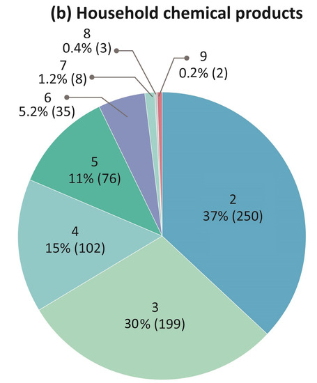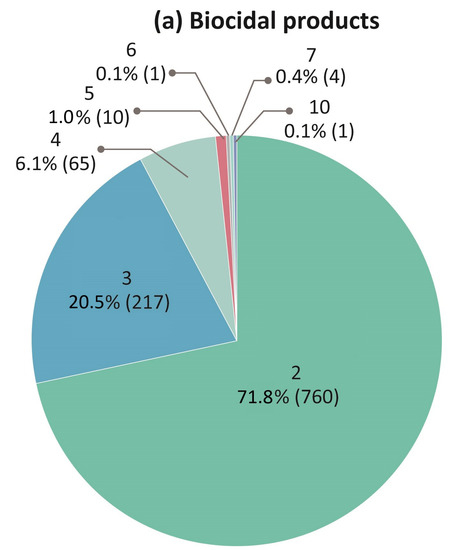 From the 1733 products in the total data, 1058 biocidal products and 675 household chemical products were found and analyzed in this study (Table 2). Based on the total data, 314 biocides were identified as being used in biocidal and household chemical products. Pest control products and air freshener dominated the biocidal products (49.7%), and household chemical products (45.3%), respectively (Figure 1).