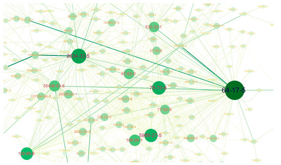 A part of the network visualization of chemical combinations in biocidal and household chemical products. Lines connect ingredients contained in the same product, and color-focused with larger size vertices means more abundantly used chemicals. The numbers in circles represent the CAS registry number of chemicals. Five compounds that have the high node’s degree in this part are shown as follows: 64-17-5 (ethanol), 2634-33-5 (BIT), 78-70-6 (linalool), 5989-27-5 (D-Limonene), and 122-99-6 (2-phenoxyethanol).