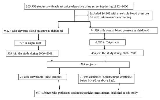 The YOung TAiwanese Cohort (YOTA) was a nationwide screening program established from 1992 to 2000 for renal diseases among age 6–18 years in Taiwanese schools [23,24]. Participants engaging in the screening program were contacted for follow-up examination in 2006–2008. Among the participants who joined the screening program and categorized with elevated blood pressure, 303 residents of Taipei completed the follow-up examination. We randomly reached out to 6390 participants with normal blood pressure and recruited 486 participants from Taipei; the detailed methods are described in our previous study [24]. We further excluded 21 participants due to missing urine samples, and 71 subjects were eliminated because their urinary creatinine concentrations were below 0.3 g/L or above 3.0 g/L, which was based on guidelines published by the World Health Organization and National Institute of Health [25,26]. Therefore, 697 participants remained as our total study population. A diagram detailing the selection criteria of study subjects is presented in Figure 1. This study protocol was approved by the Research Ethics Committee of National Taiwan University Hospital. Informed written consent was obtained from each participant and their parents before they participated in the study.