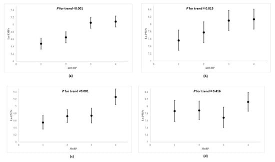 Geometric mean values and 95% confidence intervals of natural log-transformed EMPs and PMPs according to quartile concentrations of urinary ΣDEHP and MnBP a in multiple linear regression model b. (a) ΣDEHP and Ln-EMPs, (b) ΣDEHP and Ln-PMPs, (c) MnBP and Ln-EMPs, (d) MnBP and Ln-PMPs. DEHP: di-2-ethylhexyl phthalate; MnBP: mono-n-butyl phthalate; EMP: endothelial microparticles; PMP: platelet microparticles. a ΣDEHP as μmol/g creatinine, and others as μg/g creatinine. EMPs and PMPs as counts/μL. b p for trend analysis—value was modeled according to median value of each quartile of each phthalates metabolites, and was adjusted for age, gender, body mass index, total cholesterol, hypertension, diabetes, smoking, alcohol consumption, physical activity, and household income.