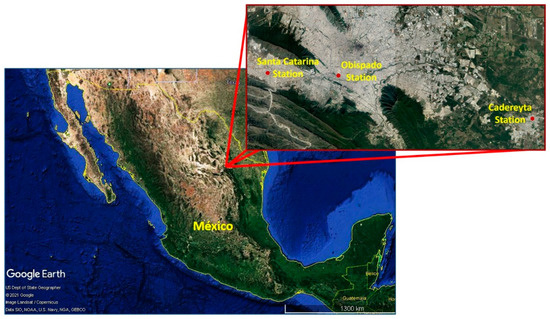 The Monterrey Metropolitan Area (MMA) is located in Northeastern Mexico, has an estimated population of 5 million people, and is the third-most populated metropolitan area in the country. Approximately 2 million vehicles, including automobiles, public transport buses, and heavy cargo trucks, commuted throughout the MMA in 2016 [38]. In addition, a large amount of industrial and commercial activity has eroded the ambient air quality such that the MMA has recently been considered one of the most polluted cities in Mexico [39]. Typical climate conditions are cold and dry weather in winter, with an average temperature ranging from 14.6–28.4 °C and an average annual rainfall of 583.2 mm [40].
