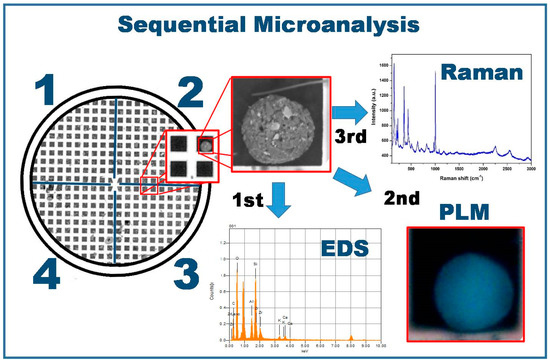 A polarized light microscope was used to determine the optical properties of the particles placed on the copper grid. The characteristics of the microscope are described in Section 2.2. A wide-range magnification objective lens (5X/0.1 BD, 50X/BD, and 100X/BD) was used to adequately visualize the particles of interest. Furthermore, the molecular composition of the particles was determined by MRS with a Horiba Scientific™ LabRam H Evolution Raman microscope at 40 mW. A 532 nm laser was directed onto each particle with the objective lens of an Olympus SLMPN 50X/0.35NA optical microscope. A Raman signal in the range of 5–20% of the beam intensity was achieved with a coupled charge detector at 220 K. The acquisition time was set at 5 s, and 15 spectra were added. The equipment calibration was performed with a silicon standard. Spectra were processed with the Horiba LabSpec 6 spectroscopy suite software. Figure 2 shows the sample preparation process used in the sequential microanalysis of the atmospheric particles.