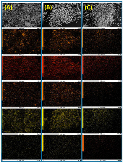 Figure 3 shows the chemical mappings of the PM collected at the three monitoring stations. The particles showed an exceptionally varied morphology; many of them were spherical or spheroidal, while others presented cleavage and features typical of crystalline materials. Conglomerates of small particles with irregular morphologies were also observed. Several previous reports have indicated that anthopogenic particles usually present spherical or spheroidal morphologies because they are generated by vapor condensation [46], while those that arise from natural sources exhibit regular morphologies with angles, cleavages, and facets [47]. According to the intensity in the color corresponding to each element and the relative abundance (see Figure S1), the chemical mappings revealed that the most abundant elements in the collected particles were the following: Si, O, Ca, Al, K, and less proportion of detected Cl, Mg, S, and Fe. The presence of Si and Al may be associated with aluminosilicates. Ca and O might be associated with CaCO3 material, which is a highly predominant crystalline component of the PM in Monterrey’s atmosphere [48].