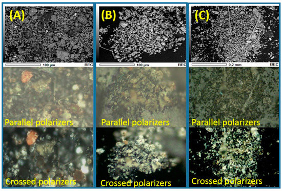 Micrographs and optical mappings with parallel and crossed polarizers obtained for the total suspended particle (TSP) collected in: (A) Obispado, (B) Santa Catarina, and (C) Cadereyta.