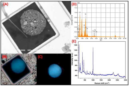 Si-rich spheroidal particles: Figure 5 shows the SMA of a spheroidal particle with a size of 25.2 µm. The micrograph clearly shows that it is formed by a conglomeration of smaller particles, some of which have facets and cleavages characteristic of crystalline materials. The EDS analysis revealed that the particle contained major constituents O, Si, and Zr with minor elements, including but not limited to Al, Ca and K. The C may be in the particle or may represent a surface coating. Optical micrographs obtained in the parallel and crossed polarization modes are shown in Figure 5B,C, respectively. The natural color of the particle seen in these micrographs resembles that of the characteristic third-order blue of zircon (ZrSiO4) [50]. Interestingly, no significant difference between the natural color and the interference color (with the crossed nicols) was found, an occurrence that may be related to the high isotropy level due to the spheroidal morphology of the particle. Isotropic opaque solids exhibit the same colors when the analyzer orientation is changed from a parallel to a crossed direction in relation to the position of the polarizer [51].