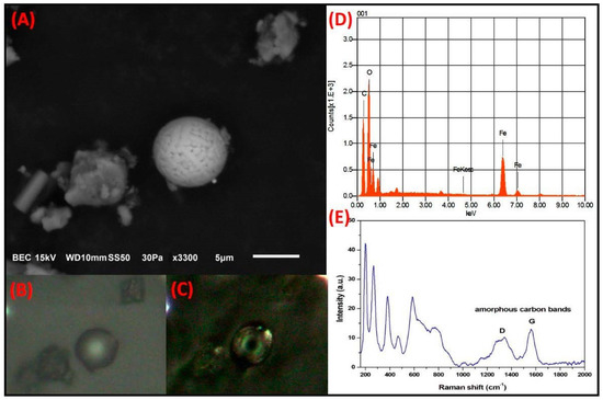 Fe-rich spheroidal particles.Figure 6 shows another particle with spherical morphology and a corrugated surface texture, with a size of 8 µm. This particle has an elemental composition of Fe, O, and C. The PLM analysis revealed that the particle acquired a dark gray color when analyzed with the nicols in parallel; however, it presented birefringence with greenish tones under cross-polarization. In contrast, a previous report stated that when Fe-rich particles of mineral origin are analyzed under polarized light, the particle colors ranged from reddish-yellow tones to brown tones and did not show birefringence [53]. Therefore, it is likely that this spheroidal particle may have been covered with deposits of carbonaceous material that gave rise to the observed colors and birefringence. Infrared and fluorescence microscopy would be required to further understand the relationship between the unexpected interference colors and the exact composition of the carbonaceous material, and our research group is currently conducting studies on carbonaceous particles using these techniques. The Raman spectrum revealed the characteristic bands of hematite (Fe2O3; 224.87 cm−1, 286.914 cm−1, 404.5 cm−1, 493.6 cm−1, 604.9 cm−1), as well as bands of amorphous C (D band at 1361.5 cm−1 and G band at 1576.5 cm−1). Particles with similar morphologies and compositions have been associated with emissions from the metal-mechanical and metallurgical industries [54]. Notably, the MMA is located in a region with a large metal-mechanical and metallurgical presence. Therefore, it is highly likely that the large number of industries in the MMA contribute to the atmospheric emission of particles having the aforementioned characteristics [55].