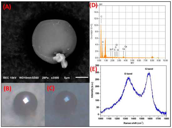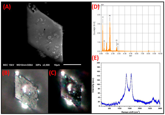 (A) Electron micrograph of a rhombic C-rich particle. Optical micrographs of polarized light with the nicols in: (B) parallel and (C) crossed. (D) Elemental analysis by SEM-EDS. (E) Raman spectrum.