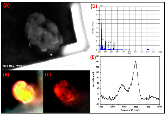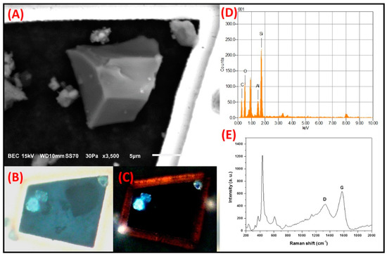 A high level of anisotropy was shown by a C-rich particle with irregular morphology when analyzed by SMA. (A) Electron micrograph. Optical micrographs with polarized light, using (B) the parallel and (C) crossed nicols. (D) Elemental composition by SEM-EDS and (E) Raman spectrum of the particle.