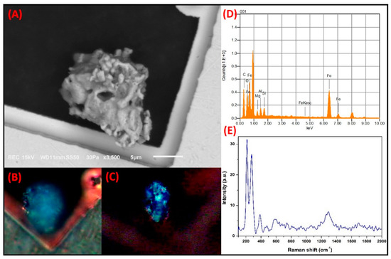 SMA study of a hematite particle possibly related to the crustal material of the MMA. (A) SEM electron micrograph. (B) Natural color and (C) interference typical of hematite mineral. (D) Elemental analysis by SEM-EDS. (E) Characteristic Raman spectrum of hematite by MRS.