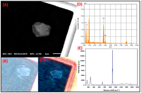 (A) Electron micrograph of a prismatic particle associated with CaCO3 from soil resuspension. (B) Natural color and (C) interference obtained by PLM. (D) Elemental analysis by SEM-EDS. (E) Bands related to the Raman modes of calcite.