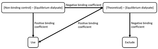 Binding coefficients for protein-PFAS pairs were calculated from the difference in PFAS concentrations (mole ratio) between the non-binding control and equilibrium dialysates. Data for all dialysis experiments were analyzed by nonlinear regression, assuming a single-site binding model using GraphPad Prism V8.1.2 (GraphPad software, San Diego, CA, USA) to determine KD [62,63,64,65]. Some EqD concentrations, when subtracted from the non-binding control, produced a negative binding coefficient indicating a final equilibrated concentration greater than the initial dialysate concentration. As both the EqD experiment and non-binding control come from the same stock, the EqD concentration should, at most, equal that of the non-binding control. This may have been an artifact of dilution; at high initial concentrations, 15 to 3000-fold dilutions were required to bring PFAS on-scale for detection. In cases where large dilution factors were required, uncertainty about the calculated final concentrations in the dialysate may be magnified. In order to better address this, a decision tree was created to determine the handling of these incidents (Figure 1).
