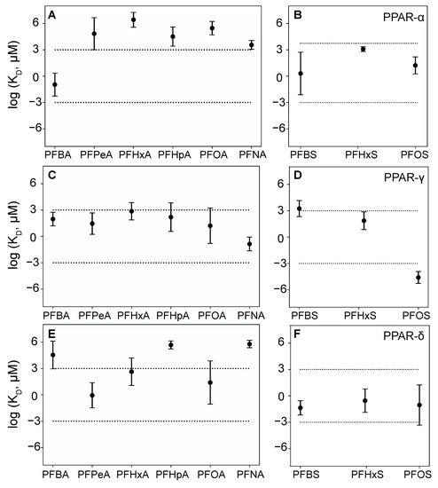 Predicted dissociation constant (KD) values (geometric mean ± 1 standard error) for different peroxisome proliferator-activated receptors (PPAR)–per- and polyfluorinated alkyl substances (PFAS) complexes. (A) PPAR-α and perfluoroalkyl carboxylates (PFCAs) (B) PPAR-α and perfluoroalkyl sulfonates (PFSAs) (C) PPAR-γ and PFCAs (D) PPAR-γ and PFSAs (E) PPAR-δ and PFCAs (F) PPAR-δ and PFSAs. Values of log KD > 3 correspond to millimolar or weaker binding, between −3 and 3 are moderate (in the micromolar range) and < −3 correspond to strong, nanomolar, or lower binding.