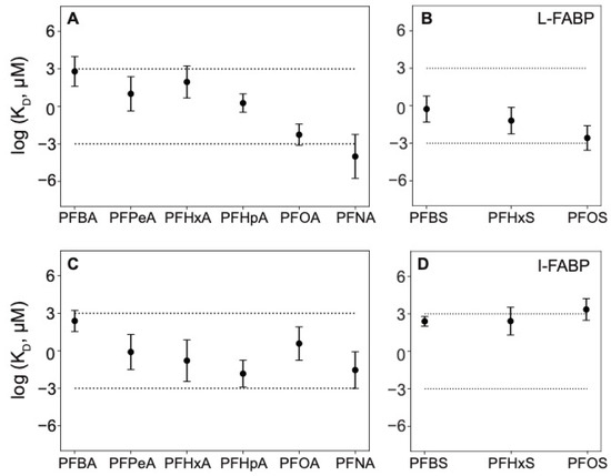 Predicted dissociation constant (KD) values (geometric mean ± 1 standard error) for (A) liver fatty acid binding proteins (L-FABP) and PFCAs, (B) L-FABP and PFSAs, (C) intestinal fatty acid binding proteins (I-FABP) and PFCAs, and (D) I-FABP and PFSAs. Values of log KD > 3 correspond to millimolar or weaker binding, between −3 and 3 are moderate (in the micromolar range) and <−3 correspond to strong, nanomolar or lower binding.