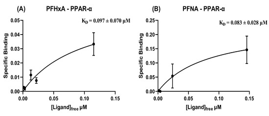 Specific binding (μmol PFAS/μmol protein) vs free concentration of PFAS (μmol/L), used for nonlinear fit of KD (in μM, ± S.E.) for (A) PFHxA and (B) PFNA with PPAR-α.
