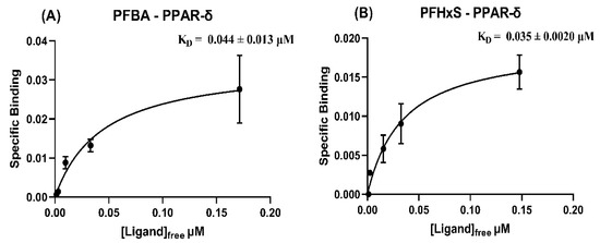 Specific binding (μmol PFAS/μmol protein) vs free concentration of PFAS (μmol/L), used for nonlinear fit of KD (in μM, ± S.E.) for binding affinity of (A) PFBA and (B) PFHxS with PPAR-δ.
