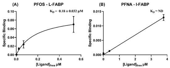 Specific binding (μmol PFAS/μmol protein) vs free concentration of PFAS (μmol/L), used for nonlinear fit of KD (in μM, ± S.E.) for binding affinity of (A) PFOS with L-FABP and (B) PFNA with I-FABP.