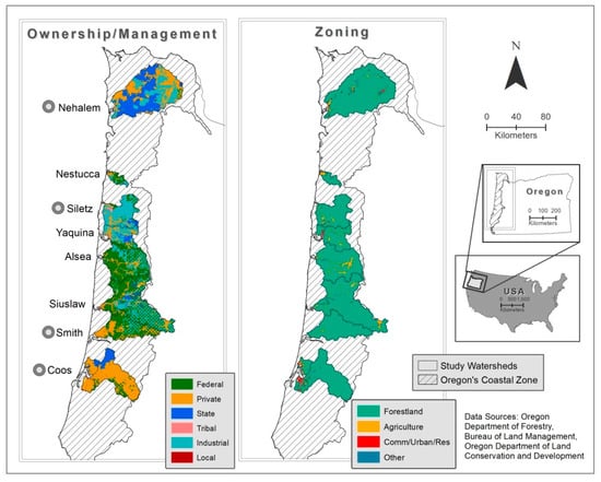 Oregon’s coastal zone, on the West Coast of the United States, encompasses the state’s coastal watersheds and extends approximately three miles seaward into nearshore marine waters []. Oregon coastal watersheds are largely forested and managed under several forestry management regimes [], with the exception of Christmas tree farms, sporadic lowland agricultural lands, and rural towns and communities scattered throughout the region. The orientation of multiple small coastal watersheds along the linear Oregon coast, coupled with broad similarity in local climatic conditions, presents an opportunity to develop comparative case histories that explore effects of forestland management practices on coastal watersheds under contrasting management regimes.