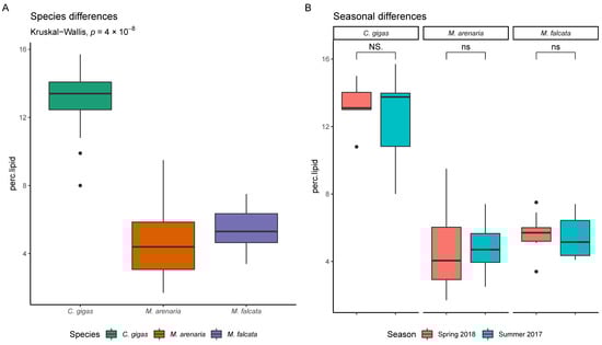 Lipid content of bivalve tissues varied between species (A) but not between seasons (B) for three species of bivalves that inhabit different areas of the coastal watersheds. ns = not significant.
