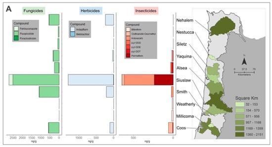 Nine unique pesticides and three pesticide metabolites were detected in bivalve tissues collected during summer 2017 and five were detected in samples collected in spring 2018 across 38% (n = 77) of all samples. All study watersheds had at least one detection, though frequency and maximum concentrations varied by season, species, and watershed (Table 3 and Figure 3A). Detections included three fungicides, seven insecticides (including the metabolite), and two herbicides. The fungicide fluopicolide was most frequently detected chemical (23% of samples) and was identified in all three species, followed by the insecticide bifenthrin (8% of samples; Table 3). Bifenthrin, indaziflam (herbicide), metolachlor (herbicide), permethrin (insecticide), and pyraclostrobin (fungicide) were the only detected compounds currently registered for use in Oregon conifer plantations [], indaziflam (trade name Esplanade F) being the only one used in modern IFM within Oregon []. Fluopicolide is registered for use on conifers in neighboring Washington State, but in Oregon is used to control oomycetes in orchards, nursery, or agriculture settings []. Legacy insecticides (DDTs), once widely used in Oregon forestlands to control pests [], were detected in one M. falcata and two C. gigas samples from summer 2017. Watershed sites exhibited a variety of chemical mixtures (summarized for each watershed in Figure 3A), with the greatest accumulation across all chemical classes in the Siuslaw and Smith, followed by the Coos watersheds. Accumulation of indaziflam, the only pesticide detected in tissue with widespread current use in forestland management, was inconsistent across watersheds, limiting further statistical analyses on watershed and management variables.