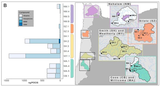 Four current-use herbicides commonly applied in spring forestland applications (pre-emergent and site preparation treatments) ranged from 1.16 to 936 ng/POCIS and averaged 277 ng/POCIS. Standard deviations at the randomly selected replicate sites were averaged across the three sites for a method standard deviation of 8.06 ng/POCIS (range 0–12.2 ng/POCIS). Detections of the forestry application compounds varied across sampling locations, with the greatest accumulations observed at sites within the Weatherly (predominantly privately managed land) and Smith (mixed federal and private management) watersheds (Figure 3B). Hexazinone was the most commonly detected herbicide (73% of samples) followed by atrazine (60%), sulfometuron-methyl (SMM; 40%), and metsulfuron methyl (MSM; 7%). Field and laboratory blanks returned no detections.