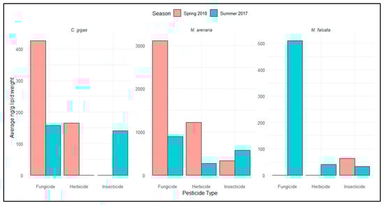 Lipid-normalization allowed for further distinction of fungicide, herbicide, and insecticide concentrations among bivalve species. The greatest cumulative and average concentrations of all pesticide classes were observed in M. arenaria, and the average body burden observed in the species was further exaggerated after accounting for lipid content (Supplementary Materials: Figure S3A,B). Average concentrations of fungicides and herbicides were elevated in spring 2018 for the estuarine bivalves (M. arenaria and C. gigas). In contrast, average concentrations of fungicides were elevated in the tissues of freshwater bivalves (M. falcata) during the summer 2017 (Figure 4), but seasonal comparisons for this species are difficult because collection locations varied between seasons. Average insecticide concentrations were high in the estuarine bivalves during the summer 2017, and the highest insecticide concentrations were observed in freshwater mussels sampled during spring 2018 (Figure 4).