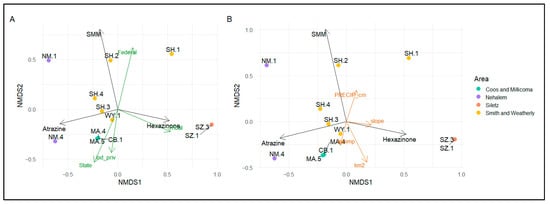 NMDS analysis elucidates associations between watershed variables and the compounds detected by POCIS monitoring, with biplots indicating relationships between compounds and forestland ownership based on shared vector direction. Federal ownership appears to be associated with SMM loading, tribal ownership is associated with hexazinone loading, and private and state ownership is associated with atrazine loadings (Figure 5A, stress = 9.62 × 10−5). Physical characteristics of the coastal watersheds appeared to have only minor associations with the chemical compound variability (Figure 5B).