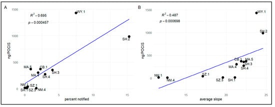 Linear regression indicated that total herbicide load captured in the POCIS was positively correlated with (A) active aerial herbicide notifications during deployment window (R2 = 0.695, p ≤ 0.001) and (B) average watershed slope (R2 = 0.487, p ≤ 0.001). Formulae and results in plots reflect calculations with both variables square root transformed to meet regression assumptions.