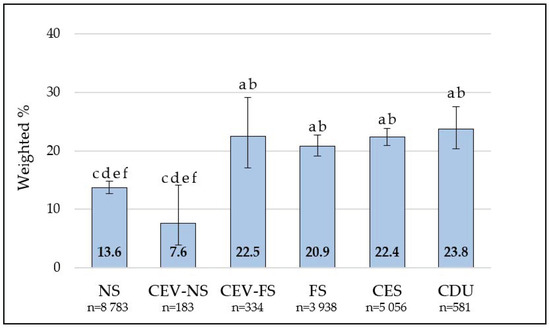 Prevalence of self-reported hypertension according to smoking and vaping status. NS = never smoker; CEV-NS = current exclusive vaper who never smoked; CEV-FS = current exclusive vaper who formerly smoked; FS = former smoker; CES = current exclusive smoker; CDU = current dual user. Superscript letters indicate significant differences during Bonferroni-adjusted pairwise comparisons: a = NS; b = CEV-NS; c = CEV-FS; d = FS; e = CES; f = CDU.