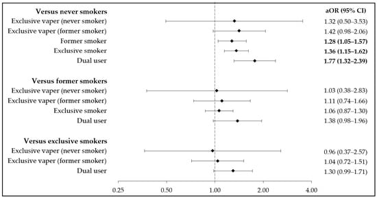 Multivariable results from modeling smoking and vaping as a composite variable are shown in Figure 2. Former smokers, current exclusive smokers, and current dual users had 28%, 36%, and 77% higher odds of hypertension than never smokers, respectively. No significant differences were observed in the odds of hypertension with former smokers or current exclusive smokers as the referent group. Point estimates in Figure 2 analyses were generally higher for current vapers who formerly smoked than for those who never smoked, but no statistically significant findings were observed.