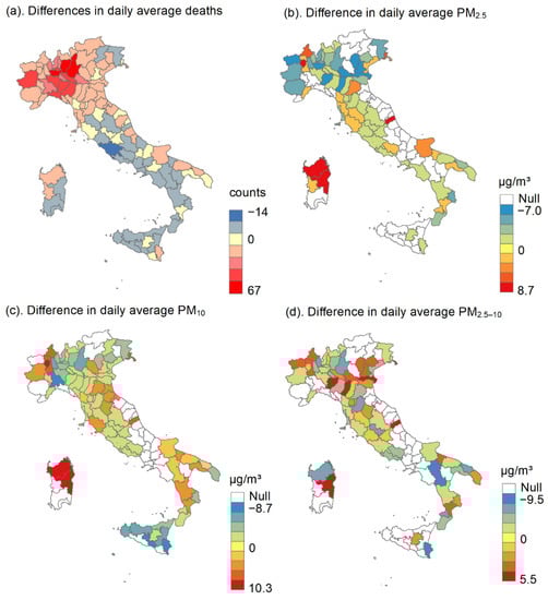 Difference in daily average deaths and the particulate matter (PM2.5 with an aerodynamic diameter ≤ 2.5 μm; PM10, ≤ 10 μm; PM2.5–10, 2.5–10 μm) in 107 Italian provinces during March and May. (a) Differences in daily average deaths, (b) Differences in daily average PM2.5, (c) Differences in daily average PM10, and (d) Differences in daily average PM2.5–10.