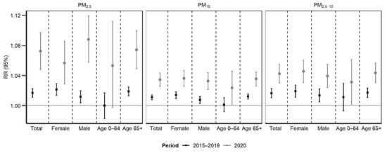 Cumulative RRs along lag 0–3 days for PM2.5, lag 0–2 for PM10, and lag 0–1 for PM2.5–10 for all-cause mortality and group-specific mortality are shown in Figure 2. Each 10 µg/m3 increase in PM was associated with a much higher increase in daily all-cause mortality during the 2020 pandemic period compared to the same months during 2015–2019 (increased mortality risk: 7.24% (95% CI: 4.84, 9.70) versus 1.69% (95% CI: 1.12, 2.25) for PM2.5; 3.45% (95% CI: 2.58, 4.34) versus 1.11% (95% CI: 0.79, 1.42) for PM10; 4.25% (95% CI: 2.99, 5.52) versus 1.76% (95% CI: 1.14, 2.38) for PM2.5–10). All p-values for the difference of the 2020 pandemic period compared to the normal period during 2015–2019 were <0.001 (Table S1). Such disparity in the PM-mortality associations were consistent among different gender and age groups. The comparison of the risks between different periods and specific subgroups were in Table S1.