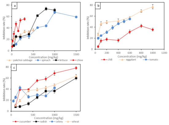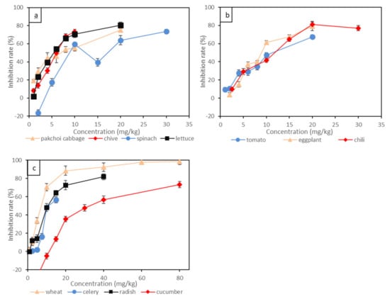 The inhibition rate of Cr(VI) on root elongation of 11 plants: (a) leafy vegetables; (b) solanaceous vegetables; (c) wheat, gourd vegetable and stem vegetable. Bars represent standard error (n = 3).