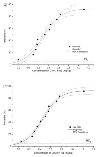 The details of formulas and parameters for SSD curves based on the Slogistic and the Exponential model are shown in Table 5. The fitted SSD curves for Cr(VI) and Cr(III) are shown in Figure 3 and Figure 4, respectively. For Cr(VI) and Cr(III), two types of SSD curves were fitted: SSD-EC10 and SSD-EC20. From each SSD-ECx curve, HC5 and HC10 were numerically derived. The HC5 values based on the EC10 of the eleven plants were 0.60 mg/kg and 4.51 mg/kg for Cr(VI) and Cr(III), respectively. Furthermore, the HC10 values based on the eleven plants were 0.83 mg/kg and 16.98 mg/kg for Cr(VI) and Cr(III), respectively. The HC values for Cr(VI) were far less than Cr(III), indicating the higher toxicity of Cr(VI) to tested plants than Cr(III).