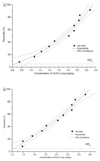 With respect to the Cr valence, the plant root growth was preferably impacted by Cr(VI) than Cr(III), since Cr(VI) produced lower EC10 and EC20 than Cr(III) did (Table 3 and Table 4). Accordingly, the HC5 value derived from EC10 for Cr(VI) was 0.60 mg/kg, which was lower than that for Cr(III) (4.51 mg/kg), demonstrating that hexavalent Cr compounds were more hazardous than trivalent Cr compounds. It was reported that the uptake mechanisms of Cr(III) and Cr(VI) were quite different, Cr(VI) was immediately converted to Cr(III) in roots by Fe(III)-reductase enzymes [,,], and plant tissues endured higher Cr(III) than Cr(VI) [,]. Thus, the total Cr contents in soil do not necessarily reflect the biogeochemical behavior of Cr since the biogeochemical behavior of Cr differs with chemical speciation [].