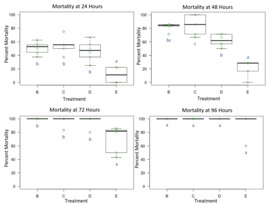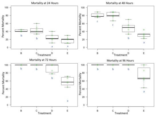 3.1. Experiment 1: Male O. lignaria Acute Whole-Body Contact Toxicity Following Whole Bodily Contact Exposure to Premix Insecticide Sprays