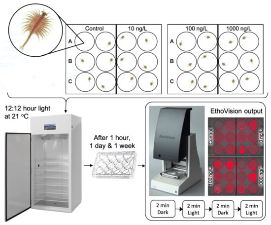 - Simão, F.C.P.; Martínez-Jerónimo, F.; Blasco, V.; Moreno, F.; Porta, J.M.; Pestana, J.L.T.; Soares, A.M.V.M.; Raldúa, D.; Barata, C. Using a new high-throughput video-tracking platform to assess behavioural changes in Daphnia magna exposed to neuro-active drugs. Sci. Total Environ. 2019, 662, 160–167. [Google Scholar] [CrossRef]