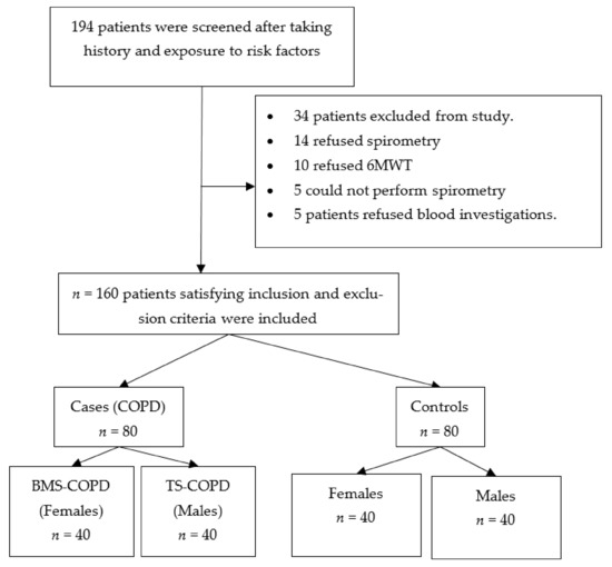 Study design and study population: A prospective case control study was carried out in patients attending a tertiary care University teaching hospital in South India between July 2020 and December 2020. Ethical clearance for the study was obtained from the institution ethics committee of JSS Medical College (Letter No. JSSMC/IEC/090620/17 NCT/2020-21 dated 12 June 2020). All subjects were enrolled after an informed consent process. Cases were subjects with COPD (n = 80) and controls were non-COPD subjects (n = 80) fulfilling the inclusion and exclusion criteria. Subjects with COPD and no other comorbidity, who were current smokers (an adult who is currently smoking) with a smoking history of >10 pack years and COPD subjects with biomass smoke index ≥40 were included as cases in the TS-COPD and BMS-COPD groups, respectively. Pack years of smoking was calculated as “average number of cigarettes smoked per day multiplied by number of years of smoking divided by 20” [16]. Biomass smoke index was calculated by multiplication of average hours of exposure to biomass smoke per day multiplied by number of years of exposure [17,18]. COPD was diagnosed and airflow limitation was categorized according to GOLD criteria “post bronchodilator forced expiratory volume in 1 s/forced vital capacity (FEV1/FVC) ratio of <0.7” and staged as mild, moderate, severe, and very severe airflow limitation [19]. Subjects with COPD, who did not have an acute exacerbation in the last three months, who had not received systemic steroids during the last 1 month, and did not have any acute infection in the last three months, were included in the study.