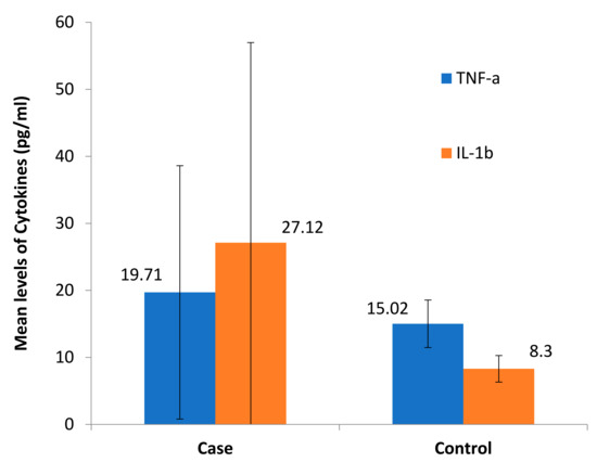 Figure 2. Comparison of tumour necrosis factor alpha (TNFα) (pg/mL) and interleukin 1 beta (IL-1β) (pg/mL) levels in COPD cases and controls. The difference in the IL-1β levels between cases and controls was significant (p value 0.0000) and the difference in the TNF-α levels was not significant (p value: 0.92).