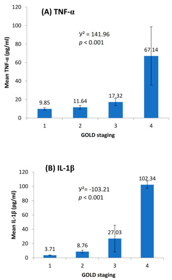 Figure 3. Dose response relationship between (A) tumour necrosis factor alpha (TNF-α) (pg/mL), (B) interleukin 1 beta (IL-1β) (pg/mL), and global initiative for Chronic Obstructive Lung Disease GOLD staging among COPD cases. The p values for the difference in mean levels of TNF-α and IL-1β between GOLD staging are: Stage 1 vs. Stage 2: TNF-α 0.81, IL-1β 0.67; Stage 1 vs. Stage 3: TNF-α 0.31, IL-1β 0.032; Stage 1 vs. Stage 4: TNF-α 0.000, IL-1β 0.000; Stage 2 vs. Stage 3: TNF-α 0.20, IL-1β 0.000; Stage 2 vs. Stage 4: TNF-α 0.000, IL-1β 0.000; Stage 3 vs. Stage 4: TNF-α 0.000, IL-1β 0.000.