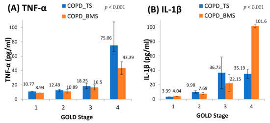 Figure 4. Dose response relationship between (A) TNF-α (pg/mL), (B) IL-1β (pg/mL), and GOLD staging among smoking COPD and biomass COPD cases. The p values for the difference between the mean levels of TNF-a among the TS-COPD and BMS-COPD were 0.32 for Stage 1, 0.017 for Stage 2, 0.176 for Stage 3, and 0.202 for Stage 4. The p values for the difference between the mean levels of IL-1β among the TS-COPD and BMS-COPD were 0.32 for Stage 1, 0.0003 for Stage 2, 0.016 for Stage 3, and 0.0455 for Stage 4.
