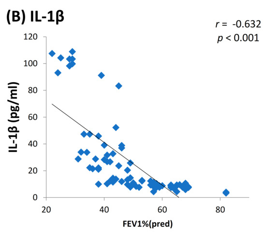 Figure 5. Correlation between levels of (A) TNF-α (pg/mL), (B) IL-1β (pg/mL), and Forced expiratory volume is 1st second FEV1%(pred) among the cases.