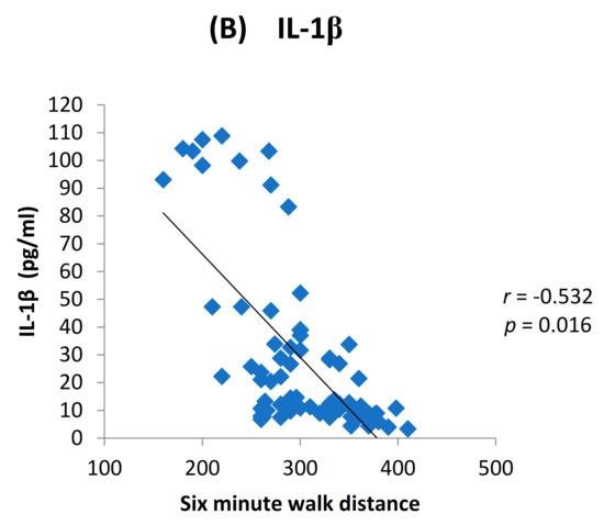Figure 6. Correlation between Six min walk test and levels of (A) TNF-α (pg/mL) and (B) IL-1β (pg/mL) among the cases.